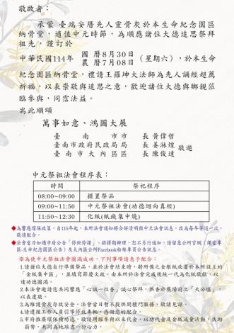 本區114年中元祭祖法會謹訂於114年8月30日(星期六)上午8時00分舉辦,禮請王羅坤大法師為先人誦經超薦祈福,歡迎鄉親蒞臨參與,同霑法益。