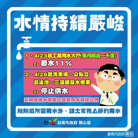 本市自4/26起洗車場、游泳池、三溫暖及水療業停止供水,請大家務必節約用水呦。