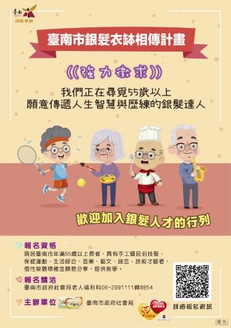 為促進本市長者社會參與,特規劃辦理「銀髮衣缽相傳計畫」,招募有專才或特殊才藝之長者,進而媒合長者至運用單位提供薪傳教學服務,以提升長者自我價值感,演譯本市活躍樂齡的長者典範。 推薦報名日期自即日起至110年5月20日截止,請鼓勵符合資格者踴躍報名。相關線上資訊,請參閱https://reurl.cc/OXKq0y。