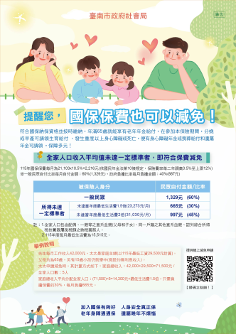國民年金提供老年年金、身心障礙年金、生育、喪葬及遺屬年金等多樣保障。為減輕民眾負擔,如國民年金被保險人「全家人口收入平均值未達一定標準」,即符合保費減免!