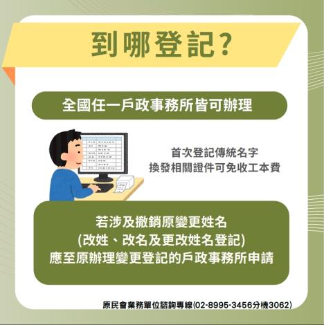 依《原住民身分法》第5條第1項第4款規定,部分族人循110年1月27日修正施行前第4條第3項規定取得原住民身分者,應於115年1月5日前,取用或以原住民族文字並列原住民父或母所屬原住民族之傳統名字,或從原住民父或母之姓,否則其原住民身分將依法喪失。※逾期辦理流程:115 年 1 月 5 日起30天內還可以補登記,30天若未主動辦理補登記,戶政事務所將發出書面通知各別(依舊法第4條第3項)受影響的族人。如有疑問請逕洽原民會業務單位諮詢專線(02-8995-3456分機3062)