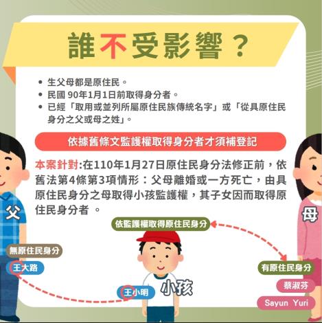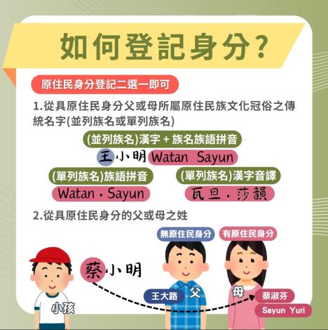 依《原住民身分法》第5條第1項第4款規定,部分族人循110年1月27日修正施行前第4條第3項規定取得原住民身分者,應於115年1月5日前,取用或以原住民族文字並列原住民父或母所屬原住民族之傳統名字,或從原住民父或母之姓,否則其原住民身分將依法喪失。