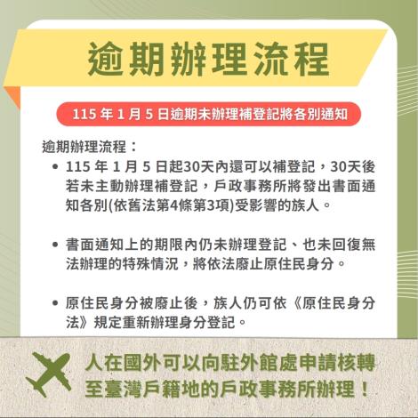 115 年 1 月 5 日起30天內還可以補登記,30天若未主動辦理補登記,戶政事務所將發出書面通知各別(依舊法第4條第3項)受影響的族人。