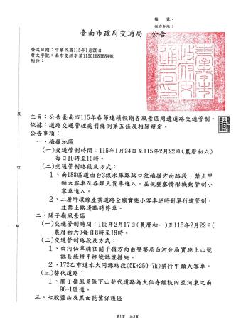 一、主旨:公告臺南市115年春節連續假期各風景區周邊道路交通管制。
