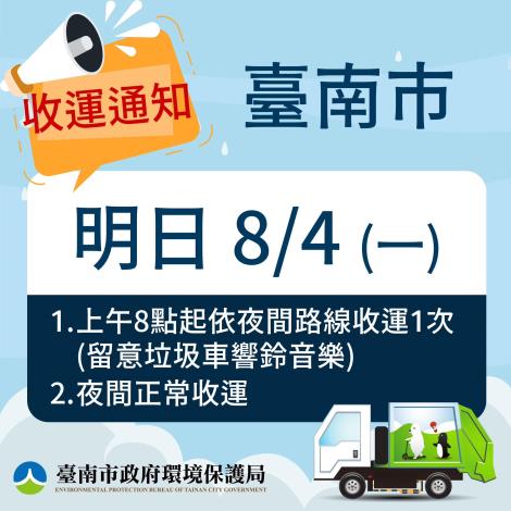 垃圾收運公告明(8/4)日全市37區「上午會加班收運」垃圾(請留意垃圾車音樂聲),若沒丟到垃圾的市民朋友不用擔心,「夜間正常收運」仍然可以丟垃圾。-民眾可以下載「臺南環保通」APP了解垃圾車即時動態。