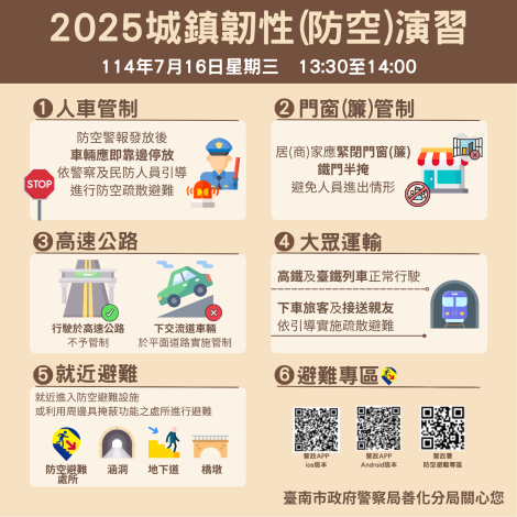 為強化全民防衛意識與應變能力,南部地區(臺南市)演習日期及時間: