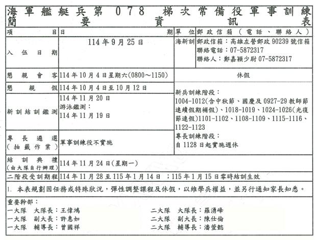 海軍新兵訓練中心接訓海軍艦艇兵常備兵軍事訓練第078梯次入營簡要資訊表